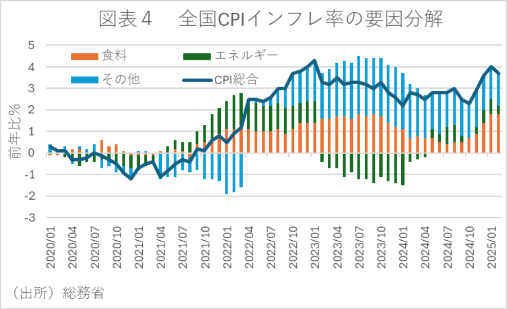 このため、費用対効果を重視するのであれば、単純に乗数効果が高い消費減税の方が給付金よりも好ましいという結論になる。特に、目標を上回るインフレで実質賃金がマイナスの状況下では、行き過ぎたコストプッシュインフレの抑制が最優先課題となる。実際、足元の消費者物価指数のインフレ率を要因分解すると、直近25年2月分前年比+3.7%の伸びのうち半分近い1.8%ポイント分が食料品の値上げで説明できる(図表4)。しかし、食料品は需給のひっ迫による上昇ではないため、コストプッシュの要素が大きいことは明らかだ。