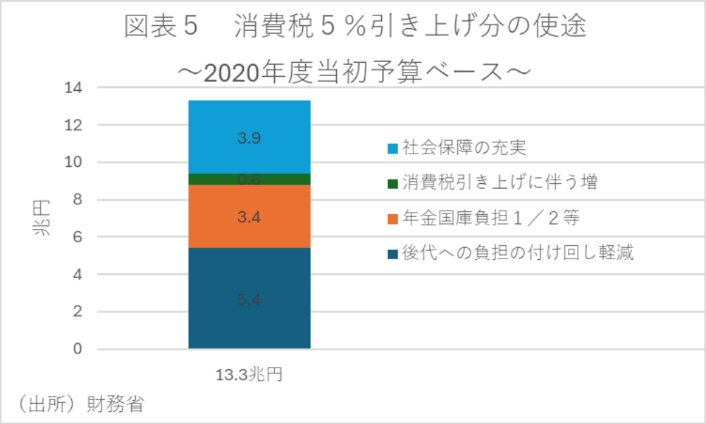 ただ、消費税は社会保障財源として紐づいているという意見もある。しかし、2020年度当初予算に基づけば、消費税率5%から10%引き上げで確保される財源 13.3兆円のうち社会保障支出に紐づいているのは8兆円程度であり、残りの5兆円以上は政府債務の返済に回るとされている(図表5)。したがって、この部分を使えば社会保障財政に直接影響は及ばないといえよう。