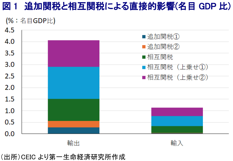 - 米中貿易戦争は米中双方に深刻な悪影響を与えることが懸念される。中国経済には輸出面だけで名目GDP比4%強、輸入面で同1%強の影響が出ると試算されるなど、景気に不透明感が高まるとともに、スタグフレーションに陥る可能性もある。3月の輸出はトランプ関税を念頭にした「駆け込み」が押し上げに繋がる一方、輸入は対照的に減少している。しかし、ハイテク関連や設備投資関連の輸入に堅調な動きがみられるなど、中国側は米中摩擦の激化による長期戦を念頭にした準備を進めている可能性が考えられる。