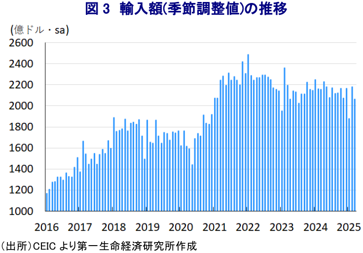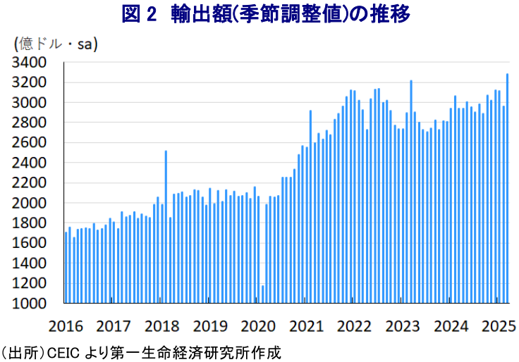 上述のように米中間の貿易戦争が激化する動きをみせるなか、3月の輸出は相互関税の賦課を前にした『駆け込み』の動きが活発化している様子がうかがえる。3月の輸出額は前年同月比+12.4%と1-2月(同+2.3%)から伸びが加速しており、当研究所が試算した季節調整値に基づく前月比も3月は大きく拡大するなど底入れの動きが確認されている。対米輸出額も3月は前年同月比+9.1%と1-2月(同+2.9%)から大幅に伸びが加速するとともに、前月比も大幅に拡大する動きをみせており、相互関税賦課を前にした駆け込みの動きが活発化していると捉えられる。さらに、米中摩擦の激化により先行きは対米輸出のハードルが高まるなか、米国以外の国・地域向け輸出を活発化させることが見込まれる。こうしたなか、3月の輸出はASEAN(前年比+11.6%)やインド(同+27.3%)、中南米(同+23.5%)、アフリカ(同+37.0%)といった新興国向けが軒並み大幅な伸びをみせるとともに、EU(同+10.3%)や英国(同+16.3%)、カナダ(同+12.9%)、日本(同+6.7%)など先進国向けも伸びが加速している。よって、足元の景気は外需の駆け込みの動きが下支え役になっていると捉えられる。種類別でも、加工組立関連(前年比+2.6%)で伸びが鈍化する一方、一般的な中国製品である一般輸出(同+13.0%)の伸びが加速していることも、駆け込みの動きが活発化していることを示唆している。
