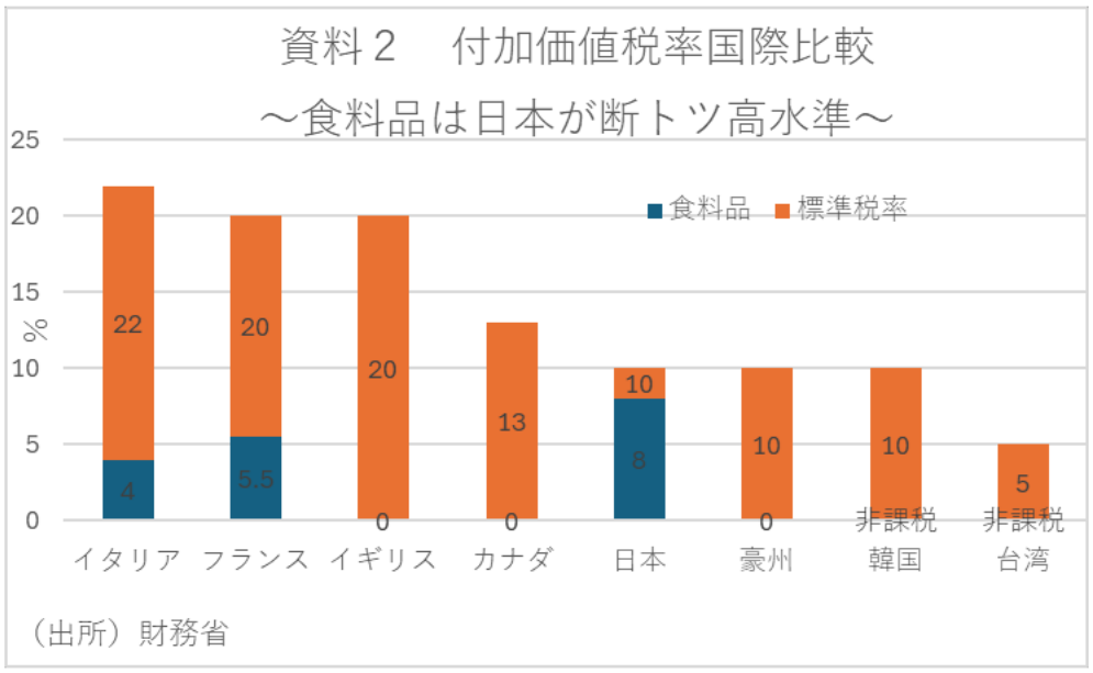 消費税率が二桁に達するような諸外国では、消費税の逆進性を緩和するために、食料品等の消費税率を0もしくは非課税とする措置などがとられている。実際、世界の食料品の税率を見ると、イタリアやフランスは標準税率が20%台なのに対し、食料品は4~5%程度に抑えられている。さらにイギリスやカナダ、豪州、韓国、台湾ではゼロもしくは非課税になっている。こうしてみると、食料品の税率を下げるというのはある程度現実的な選択肢といえる。