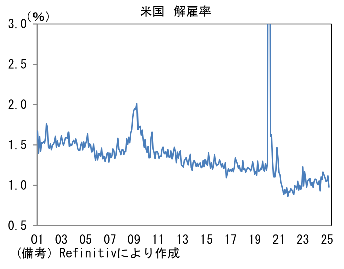 - 3月米JOLT求人件数は719.2万件となり市場予想(750万件)を下回った。政策不透明感によって企業の採用意欲が削がれている可能性は指摘できるが、一方で解雇率が0.98%へと0.14%ptも低下するなど強弱区々。転職活動の活発度合いを示す自発的離職率も2.09%と直近3ヶ月は概ね横ばいとなっている。