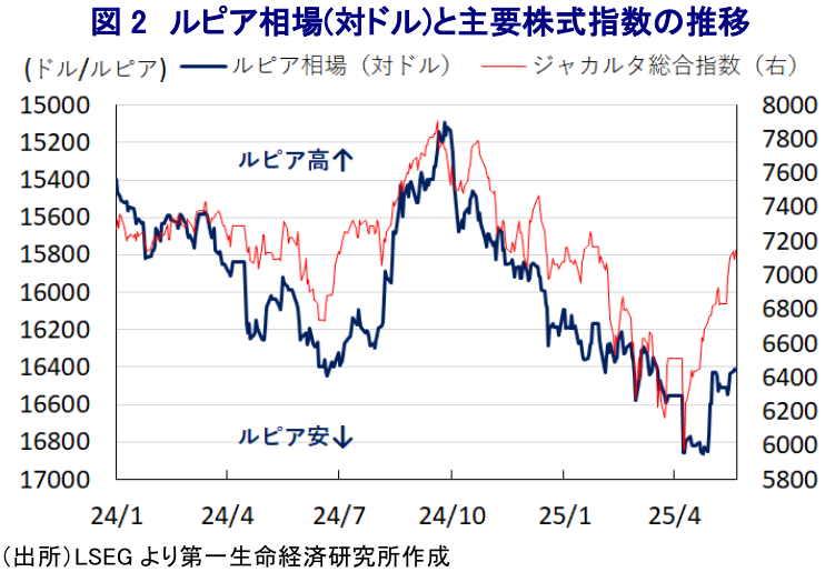 こうした状況にもかかわらず、1-3月の実質GDP成長率は前年同期比+4.87%と3年半ぶりの伸びに留まるなど、景気頭打ちの動きが確認されている(注1)。なお、インフレ鈍化による実質購買力の押し上げに加え、政権公約に掲げた学校給食の無償化や低所得者層への現金給付、無償での健康診断実施や学校改築なども追い風に、個人消費は堅調な推移をみせる。一方、金融市場では政権が掲げるバラ撒き政策が財政悪化を招くことが懸念され、政権はこうした懸念の払しょくを目的に歳出規模を大幅に削減するも、削減の対象は公共投資関連が中心とされた。その結果、道路整備や維持管理などが滞るとともに、新規建設計画の延期、ジョコ前政権の肝煎りである新首都(ヌサンタラ)建設にも遅延が生じている。さらに、公務員給与の遅配や公的部門での非正規雇用者を中心とする解雇、政府関連事業が停滞するなど幅広い経済活動の足かせとなる動きもみられる。なお、歳出削減については、アジア通貨危機の経験を踏まえて財政赤字をGDP比▲3%以下とする財政規律に沿った動きながら、バラ撒きを優先した財政運営は中長期的な観点で潜在成長率の低下を招く可能性がある。その後の金融市場において『売り圧力』が強まった背景には、そうした見方が影響した可能性がある。しかし、足元では米トランプ政権の関税政策や財政政策への懸念が『米国売り』とも呼べる動きを招いており、インドネシアにおいては主要株式指数やルピア相場、国債すべてが上昇するなど米国と対照的な動きをみせる。こうした状況も中銀の利下げを後押ししたとみられる。