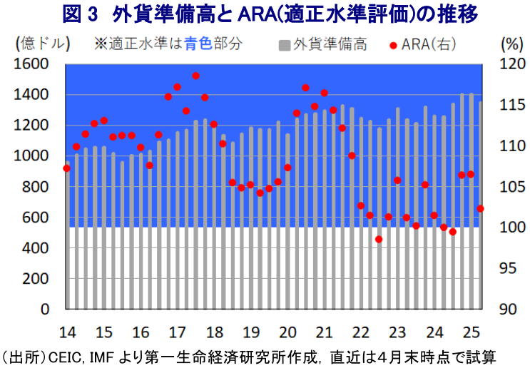また、会合後に記者会見に臨んだ同行のペリー総裁は、今回の決定について「物価を目標域に収束させた上で、ルピア相場を経済のファンダメンタルズ(基礎定位条件)に沿う形で安定を図り、持続的な経済成長の下支えを図ることに合致したもの」との認識を示した。その上で、「さらなる景気下支えに向けた利下げ余地を探る」と追加利下げに含みを持たせるとともに、「ルピア相場の安定に向けて為替介入の取り組みを強化する」と介入も辞さない考えをみせている。他方、トランプ関税について「米中協議による合意は世界経済にとって良い材料になる」とした上で、「米FRBは年内に9月と12月の2回利下げを行うと予想する」としつつ「ルピア相場に対する圧力は後退している」との認識を示す。ただし、「世界経済を巡る不確実性は依然として残っている」として、「ルピア相場の安定に向けた介入の準備を維持している」との考えを示した。なお、国際金融市場の動揺への耐性を示すARA(適正水準評価)に照らして、足元の外貨準備高は「適正水準(100~150%)」を上回ると試算されるとともに、上述のように資金流入の動きが活発化していることに鑑みれば、耐性が向上している可能性はある。しかし、足元のルピア相場の底入れは国際金融市場における米ドル安の動きが影響しているとみられるが、仮にこうした動きが変化すれば状況が大きく変わる可能性は残る。ペリー総裁が為替介入に繰り返し言及したことは、環境変化に際してのリスクを増幅させる懸念があり、今後の政策運営は引き続き外部環境に左右される展開が続くことは避けられない。
