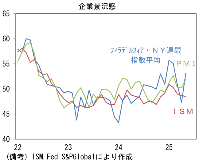 類似指標の製造業PMI確定値は52.0へと速報値から0.3pt下方修正されたものの、こちらは50をはっきりと上回った。生産(49.6→49.4)は50以下の領域に留まったものの、新規受注(50.8→52.1)は増加し、雇用(49.4→50.2)も大台を回復。サプライヤー納期(52.6→54.8※数値上昇が納期長期化を意味するよう筆者が符号調整)は長期化し、購買品在庫(48.4→57.1)は大きく積み上がった。ヘッドライン構成項目外では新規輸出受注(45.2→50.3)が大幅に上昇。製造業PMIは4月に急低下を経験していないため、解釈に窮する面はあるが、5月の数値は、全体として企業活動が打たれ強いことを示した。5月12日に対中関税の大幅に引き下げが発表されたことで、米中間の貿易取引が再開した可能性が指摘できる。またNY連銀製造業景況指数とフィラデルフィア連銀製造業景況指数が示した数値も、ISM製造業対比で強かった。