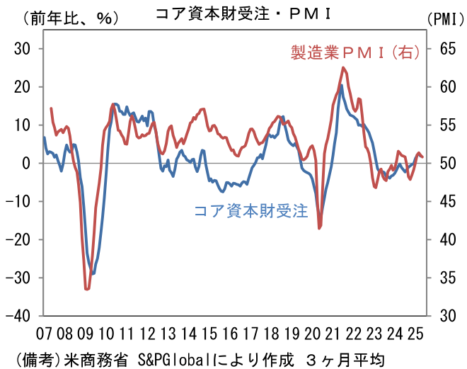 上記指標から判断すると、製造業の活動は強弱区々ながらも全体としては底堅い。通商政策に起因する不透明感によって、企業マインドが極端に委縮する事態は回避されており、設備投資も4月耐久財受注(コア資本財受注)を見る限り、緩やかな拡大を続けている。