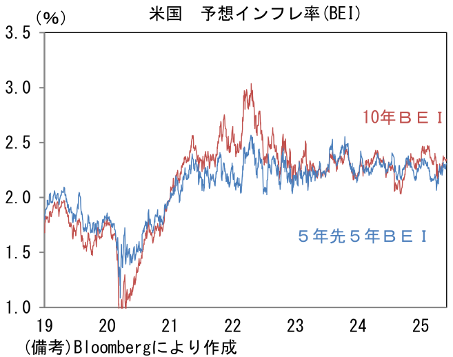 そうした下、ウォラー理事は6月1日にソウルで実施された講演で「関税によって一時的に物価圧力が高まる可能性があるものの、年内に追加利下げを行う可能性はなおある」、「政策金利を設定する際に、短期的なインフレに対する関税の影響を一時的なものと捉えることを支持する」とした。パウエル議長は2021-22年に「インフレは一時的」であるとの認識修正が遅れてしまった反省もあってか、トランプ関税の帰趨はデータを蓄積してからでないと判断できないとしているが、ウォラー理事は債券市場参加者の予想インフレ率安定を重視しているとみられる。講演では「インフレ期待に関するデータに乖離が生じている」、「市場見通しや専門的な予測をより注視している」、「実際のデータもインフレの予想経路で大きく悪化していない」などと発言した。