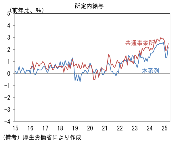 2025年入り後における毎月勤労統計を巡る経緯を整理する。基調的な賃金上昇率を捕捉する上で重視すべき一般労働者の所定内給与(共通事業所版)は2024年12月に前年比+2.9%であったものが、2025年1月に同+2.7%へと鈍化し、それに続く2月は同+1.9%と急落した。この急低下に関しては、労働時間や出勤日数の減少などから判断して「うるう年」が悪さをしている可能性が高いという見方が多く、大きく取り扱われることはなかった(うるう年の翌年は数値が低めに出ることがある)。もっとも、うるう年要因による攪乱は毎回観察されるものではなく、またそれがカレンダー要因の影響を受けないはずの一般労働者の所定内給与に対して、何故影響を与えたのかも判然としない部分があった。そして、反発が予想されていた3月分は同+2.0%と再び弱い結果となった(確報で同+2.1%に上方修正)。これもまたうるう年要因が効いた可能性が指摘された。企業の給与は、必ずしも月末締でないことから、調査対象企業が例えば25日締めに設定していれば、3月分にもうるう年影響が及ぶことになる。一方、「もしかすると本当に賃上げ率が鈍化しているのでは?」という疑念も浮上した。こうした経緯を踏まえると、4月の+2.5%という伸び率は「微妙」という判断にならざるを得ない。引き続き、賃上げ率が実勢として鈍化しているという疑いは、残しておいた方が良さそうだ。