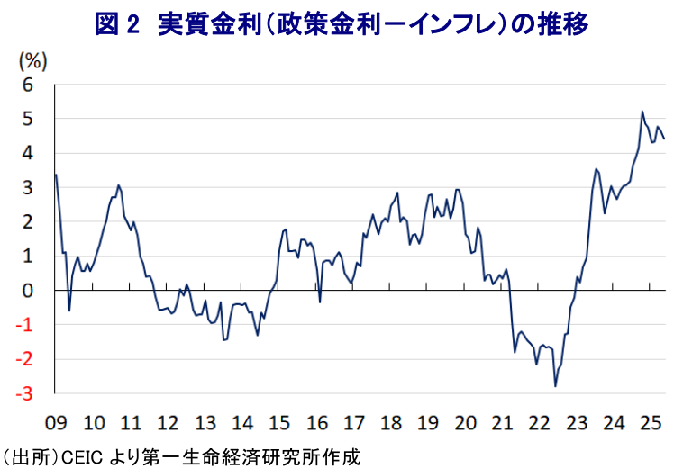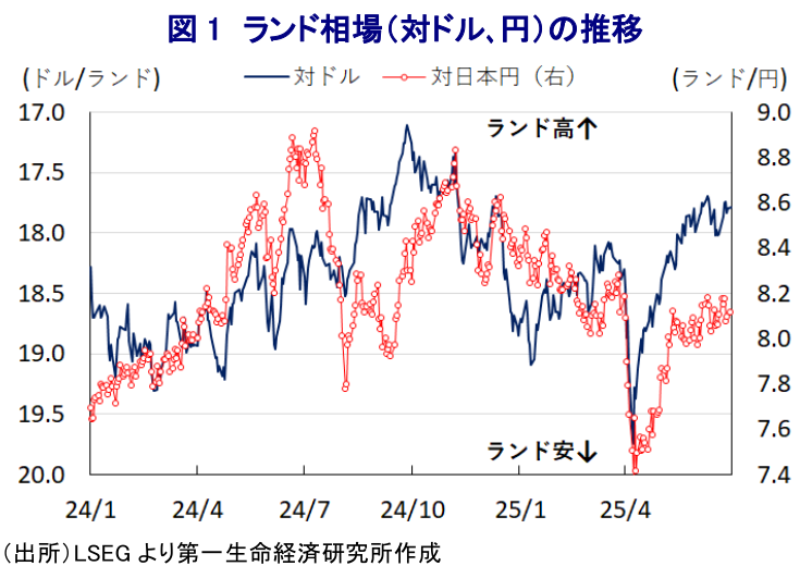 このように、ラマポーザ連立政権は不安な形で船出を迎えた。さらに、その後もANCが主導する学校における使用言語を定める教育関連法改正、公正かつ公平な公共の利益を目的に政府が補償なしに土地収用を可能とする土地収用法改正、予算案などを巡って、DAはその内容に反発を強める場面がみられた。その結果、ラマポーザ連立政権は同床異夢感が強いなかでの政権運営を余儀なくされた。そして、土地収用法を巡っては、米トランプ政権が批判を強めるなど外圧にも晒される展開が続いた(注2)。また、過去2年の経済成長率は1%に満たない水準に留まるなど、新興国のなかでも勢いに乏しい。このように国内外に不安要因が山積し、実体経済も力強さを欠くにもかかわらず、国際金融市場において同国通貨ランドは堅調な推移をみせてきた。なお、ランド相場が堅調な動きをみせた背景には、米トランプ政権の政策運営を巡る不透明感を理由に米ドル安の動きが進んでいることに加え、同国は長らく世界有数の金産出国であった名残として、このところの金価格の上振れや高止まりしていることが影響している可能性が考えられる。さらに、足元のインフレはSARB(中銀)が定める目標域を下回るなど落ち着いた推移をみせる一方、SARBは慎重な政策運営を続けており、結果的に実質金利(政策金利-インフレ)は歴史的高水準となるなど、投資妙味が高いこともランド相場を下支えしていると考えられる。