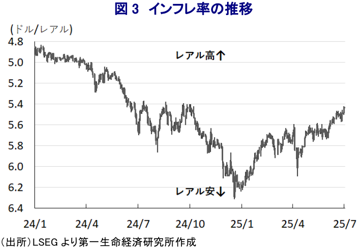 一方、金融市場では景気の頭打ちが意識されるなかで、中銀は将来的に利下げに追い込まれるとの見方がくすぶる。同国では来年10月に次期大統領選が予定されるなか、現職のルラ氏は再選を目指しており、中銀に対して景気下支えに向けて利下げを求めるなど『圧力』を強めるとの見方が影響している可能性がある。こうしたなか、先月末に中銀が公表した最新の金融政策報告において、2027年末時点のインフレ率を+3.2%と目標の中央値(3%)を上回る水準に留まるとしつつ、政策金利を据え置く戦略に自信を持っているとの考えを示した。また、当面の金融政策の判断に影響を与える2026年末時点のインフレ率も+3.6%と目標を上回るとしており、先月の利上げ決定を正当化する内容となっている。ただし、上述したように中銀は利上げ局面の打ち止めに含みを持たせたものの、そのハードルは依然として高い様子がうかがえる。さらに、中銀は伝統的に『タカ派』姿勢を志向するとともに、インフレを目標の中央値に安定的に収束させることを目指す傾向がある。報告書公表に併せて行われたオンライン会見において、同行のガリポロ総裁はインフレ目標の実現に向けて全面的な取り組みを強化する姿勢は変わらないとしている。そして、インフレ見通しについて市場予想を勘案したとしつつ、実際の経路を示しているものではない、インフレ目標実現への道筋は幾つかの経路が想定されると述べるなど、インフレ抑制に苦慮している様子がうかがえる。なお、足元の金融市場では、通貨レアルの対ドル相場は米トランプ政権の政策運営に対する不透明感を受けた米ドル安の動きが下支えするなか、中銀のタカ派姿勢があらためて意識されていることも相場を下支えしている可能性はある。その意味では、上述のように金融市場が危惧するルラ政権による中銀への政治的介入の有無やその動向に注意を払う必要性が高まっていると判断できる。