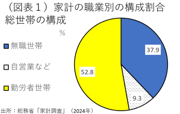 このデータは、世帯割合でみると、年金生活世帯がもっと高いことがわかる。2024年の家計構成は、37.9%の世帯が無職世帯である(総務省「家計調査」総世帯ベース、図表1)。無職世帯とは、そのほとんどが年金生活世帯であろう。彼らは、物価上昇率よりも低い年金支給額の増加率に甘んじている。ここが国民の多くが物価対策を求める理由の背景になっている。年金生活世帯が物価上昇率に割り負ける年金しか受け取れないことが、政治に減税・給付金を求める経済的背景になっている。その構造は、一時的に給付金をばらまいても何の解決にもならない。消費税減税をすれば救済されるかと言えば、こちらも逆に年金給付財源の穴を広げることになって自己矛盾に陥る。2004年の年金改革でマクロ経済スライドが導入されて、日本はこうなる運命にあった。公的年金制度を見直すことは本当に骨が折れる。その問題に向き合わずに弥縫策で凌ごうとすれば、いつまで経っても刹那的な対応が繰り返される。