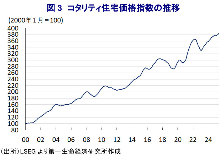 - インフレは落ち着いた推移をみせる一方、足元では不動産価格が都市部を中心に上昇して過去最高値を更新するなど利下げの副作用が懸念される動きもみられる。政府はここ数年、不動産価格抑制に向けた規制強化など取り組みを強化させているが、金融緩和によってその効果が打ち消されている可能性がある。