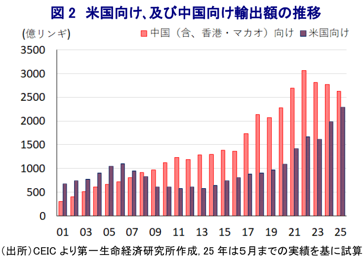 こうしたなか、足下の世界経済や国際金融市場は米トランプ政権の関税政策に翻弄され、同国もその『標的』となっている。同国は米国の貿易赤字国として14番目に位置しており、米国は同国に対する相互関税の税率を当初24%と周辺国に比べて低めに設定した上で、上乗せ分の延期期間中に個別協議を進めてきた。なお、同国は経済構造面でASEAN(東南アジア諸国連合)のなかで輸出依存度が相対的に高い上、対米輸出額は名目GDP比10%強に及ぶため、仮に高関税が課されれば実体経済に深刻な悪影響が出ることは避けられない。さらに、ここ数年の同国では、中国の景気鈍化を受けて対中輸出が頭打ちする一方、米中摩擦が激化する背後で対米輸出は拡大する対照的な動きをみせており、米国経済への依存を強めてきた。こうしたなか、米トランプ政権は協議期限の直前に各国に書簡を送るとともに、来月1日付で適用する相互関税を明らかにし、そのなかで同国に対する税率を25%と当初案から1pt引き上げた。なお、同国政府に拠れば、一連の協議に際して米国からデジタル課税や電子商取引、医療基準、ハラル認証、政府調達などに関連して強い要求が行われた模様である。その上で、米国との協議を巡って「『レッドライン』を越えることはない」との認識を示す一方、「取引のための取引はしない」としつつ「未解決の課題は協議を経て解決可能と確信している」との考えを示している。ただし、米国とベトナムの合意では相互関税を20%、第三国から同国経由の輸出品への関税を40%としており、この水準が『ベンチマーク』となることが予想される(注1)。よって、今後予定される協議が難航する可能性は低くないと見込まれる。