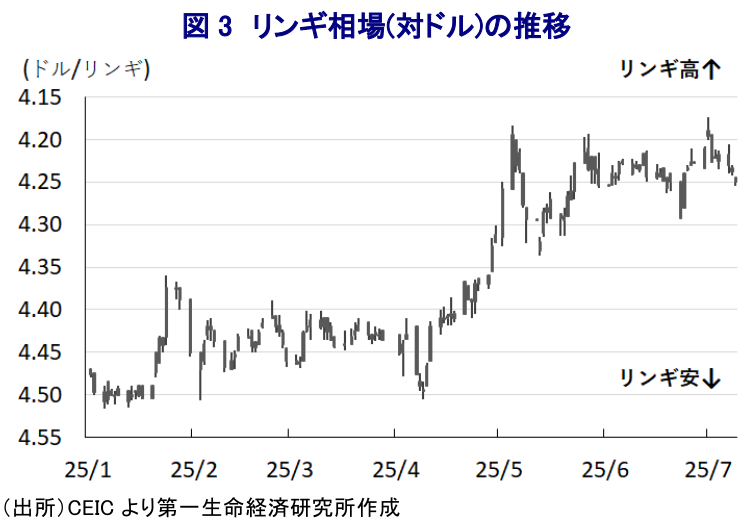 こうしたことから、中銀はこれまで引き締め姿勢を維持したものの、米国の関税政策など実体経済への不透明要因が山積するなか、景気下支えに向けた予防措置として利下げに動いたものと捉えられる。会合の公表した声明文では、世界経済について「引き続き拡大が見込まれる」としつつ、「関税政策を巡る不確実性や地政学リスクの影響を受けるとともに、国際金融市場や商品市況のボラティリティを高める」との見方を示している。一方、同国経済については「足下では堅調な内需を下支え役とする拡大が続いている」とした上で、「通商協議が良好な形で進めば輸出の改善が見込まれる」としつつ、「景気見通しへのリスクバランスは下振れ方向にある」との認識を示している。また、物価動向については「世界的な物価上昇圧力の後退に加え、内需による押し上げも小さく緩やかな推移が続く」とした上で、「構造改革による物価への影響も全体的に抑制される」との見通しを示している。他方、リンギ相場については「引き続き外部環境に左右される」とした上で、「良好な景気動向と構造改革、資金流入促進への取り組みがリンギ相場を下支えする」との従来からの見方を維持している。そして、政策運営について「外部環境を巡る不確実性が景気に影響を与える可能性があるなか、予防措置として利下げを実施する」とした上で、「引き続き景気動向と物価を巡るリスクバランスを評価しつつ状況を注視する」との考えを示した。足下のリンギ相場は米ドル安の動きを反映して堅調な動きをみせるが、先行きは米ドル安が下値を支える可能性はあるものの、中銀によるさらなる利下げが意識されることで上値が抑えられることも考えられる。
