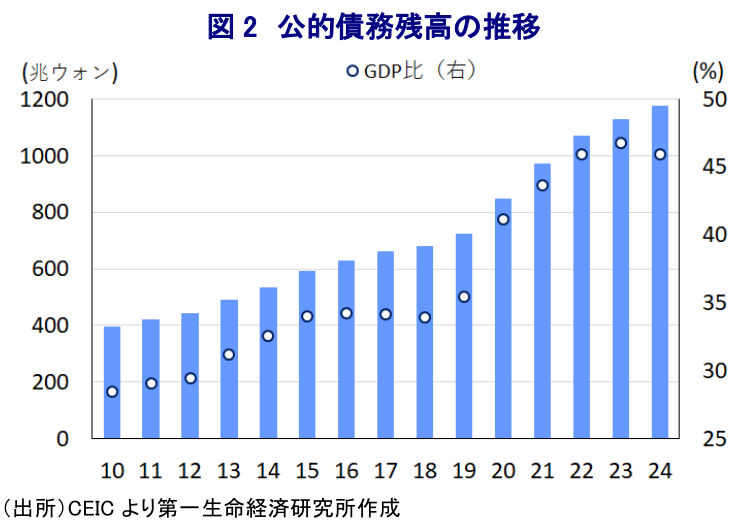 また、昨年末の尹悦錫(ユン・ソンニョル)前大統領による非常戒厳の発動を契機とした政治混乱は、4月に憲法裁判所が尹氏に対する罷免を決定したほか、先月に実施された大統領選を経て李在明(イ・ジェミョン)政権が発足したことで収束が図られている。李政権は最重要政策課題に早期の経済の立て直しと景気回復を掲げるとともに、その実現への取り組みを強化しており、政権発足から2週間で20.2兆ウォン相当の追加歳出を含む総額30.5兆ウォン(GDP比1.2%)規模の2次補正予算を編成した。同国では前政権下で13.8兆ウォン(GDP比0.5%)規模の補正予算が成立したばかりではあるものの、2次補正予算では李氏の看板政策である商品券(国民1人当たり15~30万ウォン相当)配布のほか、建設関連の財政支援、人工知能(AI)分野や中小企業への投資、中小企業向け債務再編プログラムなどを盛り込むなど、早期の景気回復実現を後押しするとしている。なお、補正予算によって相当程度景気が押し上げられる可能性はある一方、総額30.5兆ウォンのうち19.8兆ウォン相当は国債発行により賄われる計画であり、同国ではコロナ禍を経て公的債務残高のGDP比は上振れするなど財政状況は厳しさを増しており、さらなる財政状況の悪化に繋がることは必至と見込まれる。景気下支えを図るべく、中銀は金融緩和を通じて政府と共同歩調を取る姿勢を鮮明にしていると捉えられる。
