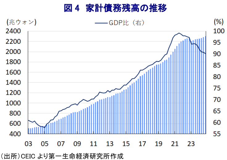 - 一方、足下では昨年来の利下げの副作用として、家計債務は増加し、不動産価格も上昇している。特に、ソウル周辺の不動産価格は上昇ペースを加速させるなど、新たなリスク要因となる懸念が高まっている。