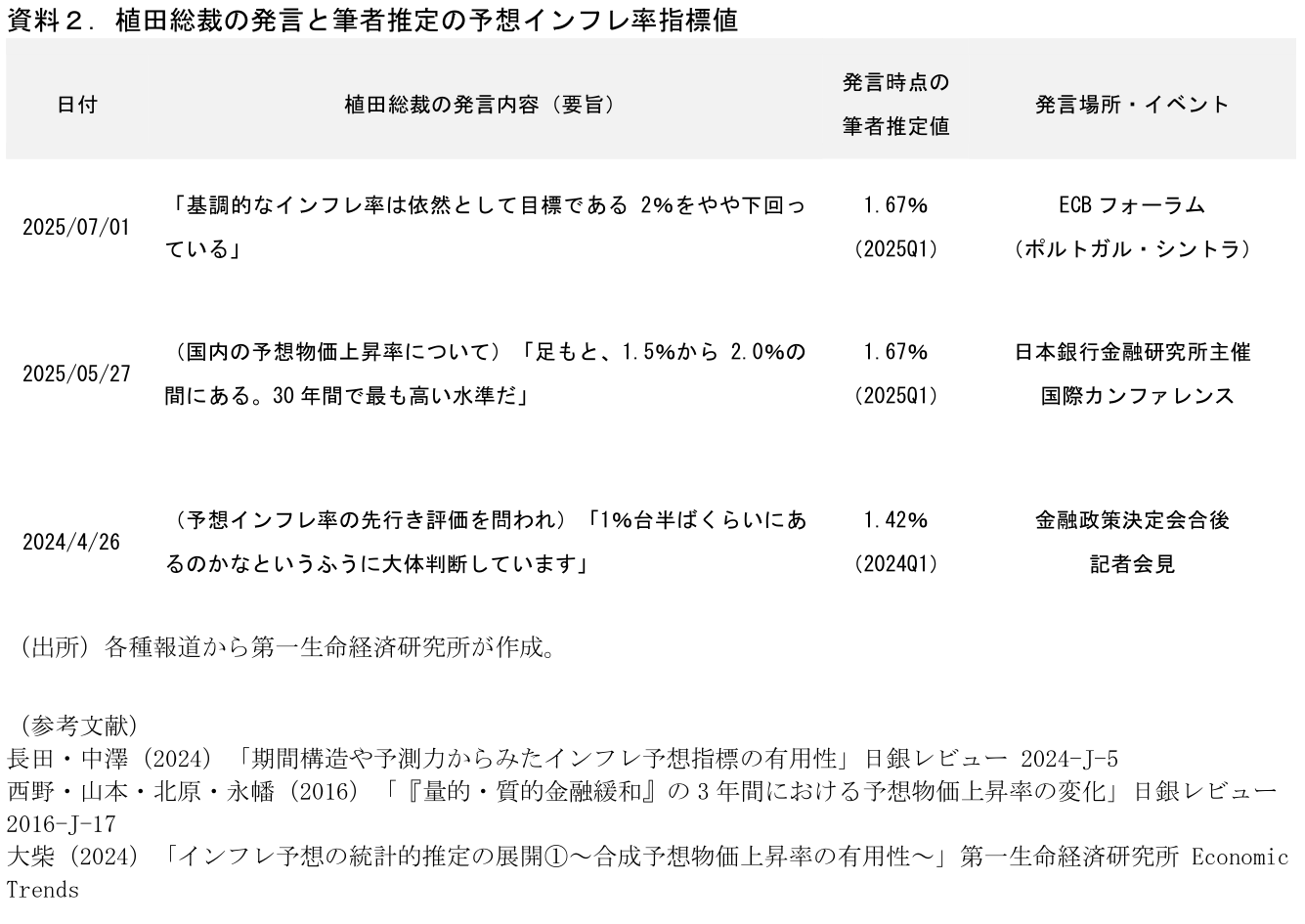日銀は過去から物価の状況を説明する際に「基調的インフレ率」を度々取り上げており、最近も植田総裁は基調的インフレ率が依然として目標である2%を「やや下回っている」と述べている(1日、ECBフォーラム)。日銀の説明する「基調的インフレ率」の定義ははっきりしたものではないのだが、それをみるうえで重視しているもののひとつと考えられるのが予想インフレ率である。合成予想インフレ率は家計・企業・専門家の予想インフレ率を複合した指標として、日銀からの公表資料でも複数回登場しており、過去の総裁発言でもその水準感を参照しているとみられるものが複数ある(資料2)。