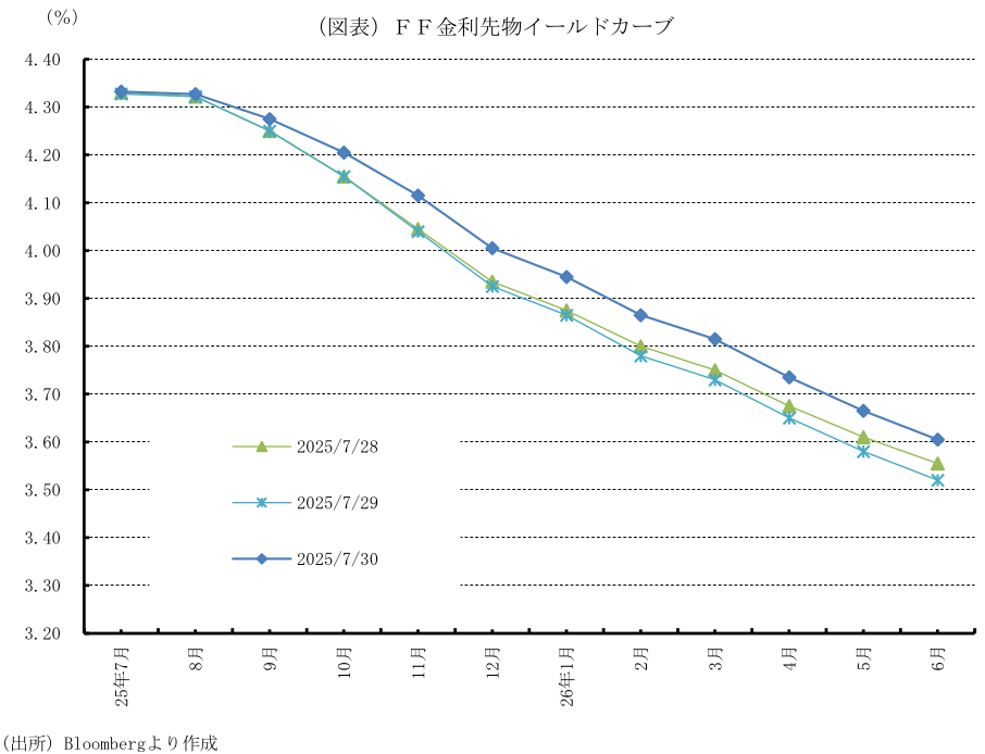 25年7月29、30日に開催されたFOMCで、FRBは政策金利を予想通り5会合連続で据え置き、FFレート誘導目標レンジを4.25~4.50%に維持することを賛成多数で決定した。また、バランスシートの縮小策の継続を決定した。