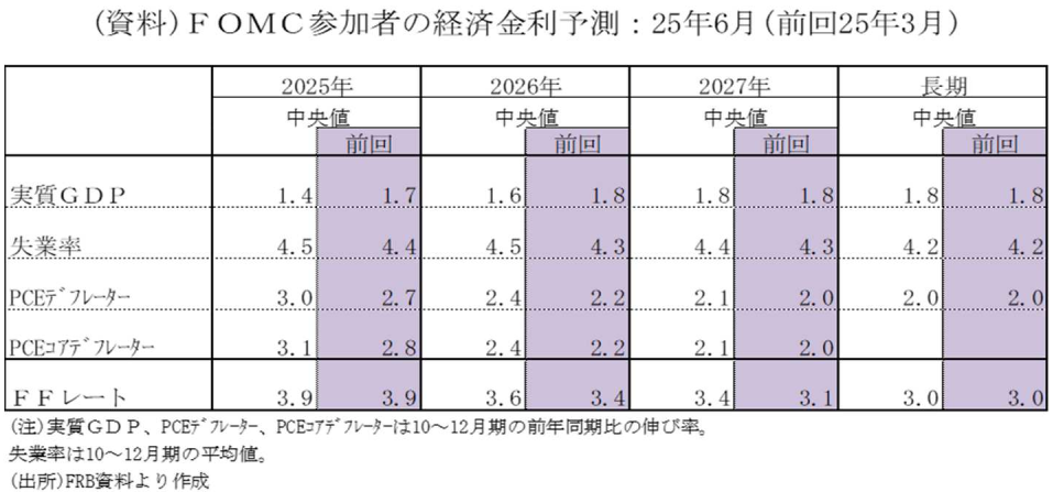 声明文と同時に公表されたFOMC参加者の経済・金利予測中央値(25年6月)では、25年の実質GDP成長率(10-12月期:前年同期比)が+1.4%(前回+1.7%)と下方シフトした一方、失業率が4.5%(同4.4%)、PCEコアデフレーター(10-12月期:前年同期比)が+3.1%(同+2.8%)と上方シフトした。これらの予測に関して、FOMC参加者は、成長率の下振れリスク、インフレ率や失業率の上昇リスクの他、これらの不確実性が3月予測よりは和らいだが高い水準との見方を示した。パウエル議長は、「個別の予測は常に不確実性に左右され、その不確実性は極めて高い」と指摘したうえで、「これらの予測は委員会の計画や決定ではない」と改めて強調した。