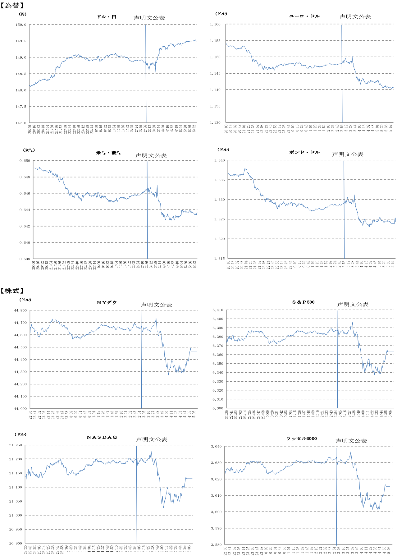金融市場では、声明文の景気判断が下方修正されたことを受け、9月利下げ期待を高め、金利が低下、ドルが主要通貨に対して弱含んだ。また、主要株価指数は徐々に水準を切り上げた。しかし、パウエル議長が記者会見で、「9月会合については何も決めていない」との判断を示したほか、不確実性の高さや、インフレへの懸念を強調したことで、早期の利下げに慎重と受け取られ、金利が上昇し、ドルは主要通貨に対して強含み、主要株価指数は下落した。