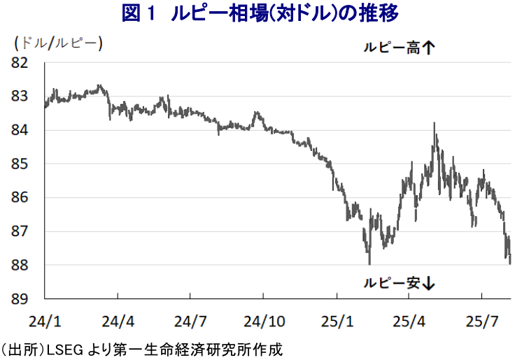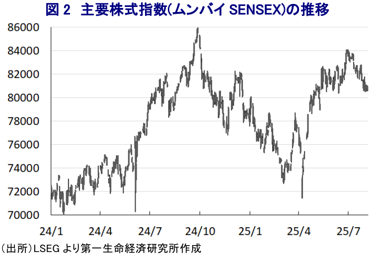 このところの世界経済や国際金融市場は、トランプ米政権の関税政策に翻弄されている。米国は、安全保障上の脅威への対応を目的に自動車や自動車部品、鉄鋼製品、アルミ製品に追加関税を課している。さらに、貿易赤字の縮小を目的にすべての国に一律10%、一部の国・地域に税率を上乗せする相互関税を課す方針を示した。相互関税は4月に一旦発動されたが、直後の金融市場の動揺を受けて、上乗せ分を90日間延期して個別に協議を行う方針に変更された。また、先月初めの90日間の延期期限到来直前に、米国は協議期限を事実上延期した上で、各国や地域に対する新たな税率を通知した。このように米国の関税政策は混乱した展開をみせているものの、このところの金融市場ではトランプ氏の『TALO(暴言)』と『TACO(腰砕け)』が繰り返されてきたため、最終的に事態は収束するとの期待感がある。さらに、金融市場ではトランプ米政権の政策運営に対する不透明感などが米ドル安を招くとともに、リスク選好が高まるなかで新興国資産に資金が流入する動きもみられる。こうした状況にもかかわらず、上述したようにルピーの対ドル相場は一時最安値を更新するとともに、持ち直しの動きをみせた主要株式指数(ムンバイSENSEX)も足元では上値が重い動きをみせるなど厳しい状況に直面している。