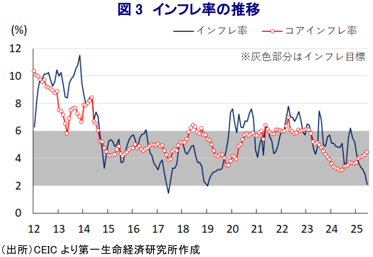 こうしたなか、RBIは今回の決定で様子見姿勢を維持した上で、会合後に公表した声明文で世界経済について「厳しい状況が続いている」とする一方、同国経済について「引き続き底堅い上、見通しに沿った動きをみせている」との見方を示している。なお、同国景気については「農村部を中心とする個人消費の堅調さや公共投資が下支え役になっている」一方、「モンスーン(雨季)の雨量が農業部門を支えており、サービス業や建設業にも底堅さがみられるが、電力や鉱業は力強さを欠くなどバラつきが鮮明になっている」との見方を示す。その上で、先行きの景気見通しについて「今年度(2025-26年度)の成長率は+6.5%」とした上で「リスクはバランスが取れている」と従来からの見方を維持している。また、足元の物価が頭打ちの動きを強めていることを反映して、先行きのインフレ見通しは「今年度は+3.1%」と前回会合時点(+3.7%)から下方修正する一方で「リスクはバランスが取れている」との見方を示している。その上で、今回の決定に関して「足元の景気は見通し通りではあるが、関税を巡る不確実性は高まっている」としつつ、「年明け以降の利下げによる実体経済への効果は今後も継続が見込まれる」とした上で「全会一致で据え置きに加え、政策スタンスも中立姿勢を維持することを決定した」との考えを示した。なお、6月会合で決定された現金準備率の引き下げは今後段階的に行われる予定であり、RBIは現行姿勢による様子見姿勢を維持する展開が続く可能性は高いと見込まれる。その一方、トランプ関税の行方は、ルピー相場を含めて金融市場を揺さぶるとともに、実体経済にも少なからず影響を与えることが予想されるものの、金融政策の対応では困難な展開が続く可能性もある。金融市場においては中長期的な観点でのインドに対する期待は高いと見込まれるものの、短期的にはロシア産原油の輸入国に対する2次関税のほか、医薬品に対する最大250%の関税に言及するなどトランプ関税の行方に揺さぶられるなど、逆風に晒される可能性に留意することが必要と捉えられる。