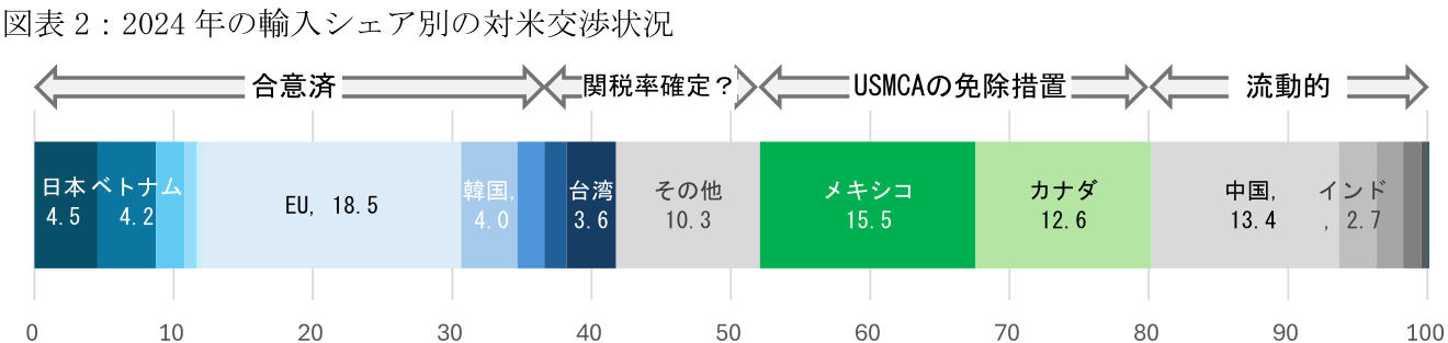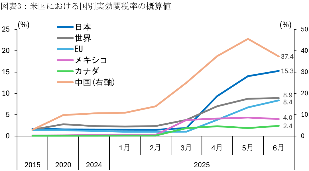 7月31日、トランプ米政権は8月7日から適用される新たな相互関税率を公表した(図表1)。事前に貿易合意に達していた日本(4/2公表値:24%→8/7時点:15%)やEU(20%→15%)に加えて、公表時点で交渉状況が不透明であったタイ(36%→19%)やマレーシア(24%→19%)など多くのアジア諸国が4月2日の公表値よりも低い税率に収まった(図表1)。現時点で関税率に流動的な要素が残る主要国は中国(54%→30%)、インド(26%→25%[8月27日に50%へ引き上げ予定])、スイス(31%→39%)、ブラジル(10%→50%)などに限られ、これらの国々が米国の輸入に占める割合は2割程度に留まる(図表2)。なお、メキシコ(25%→25%[8月1日予定の30%への引き上げを90日間延長])やカナダ(25%→35%)は米国との交渉が難航しているとみられるものの、米国・メキシコ・カナダ協定(USMCA)に準拠した輸入品は追加関税が免除される。このため、両国からの輸入に対する関税負担は比較的抑制されており(図表3)、特にカナダに関しては95%の対米輸出がUSMCAに準拠し、追加関税を課されないとの見方がある(カナダ中銀による試算。自動車など品目別関税を除く)。