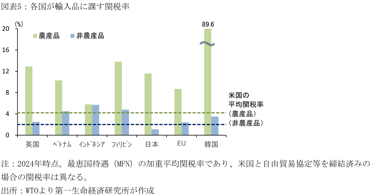 トランプ大統領はベトナム、インドネシア、フィリピンが対米輸入品への関税をほぼ撤廃すると言及している。これらの新興国は工業製品に対する関税率が米国よりも高く(図表5)、関税の引き下げ余地が大きい。一方、日本などは工業製品における関税引き下げ余地が少なく、高関税が残る農産品の市場開放には国内調整の難航が見込まれていた。このため、日韓両国の合意内容には対米輸入品に対する関税の引き下げは大きく言及されていない。他方、EUも工業製品の関税引き下げ余地は小さかったものの、米国から輸入する自動車関税10%に関しては2.5%(最終的にはゼロ)に引き下げる譲歩に踏み切っている。