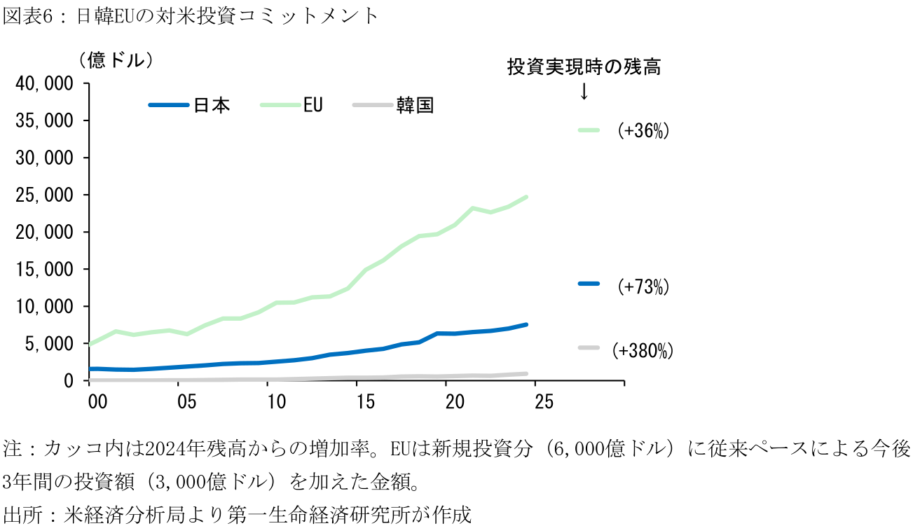 関税率の引き下げ余地が限られる日本・EU・韓国は、対米投資の拡大を通じて米国の製造業再興に貢献する姿勢を示した。トランプ政権等の発表に基づくと、日本は5,500億ドルを「米国の指示の下」、EUは6,000億ドルを「既存の年間1,000億ドル超の投資額に加えて」、韓国は3,500億ドルを「米国の所有と管理に基づき」、それぞれ投資を行うとしている。なお、日本政府は「5,500億ドルの大半は融資や融資保証の枠」「5,500億ドルの1~2%は出資であり、出資割合に基づき、日米の利益配分が1対9になる」と言及するなど、日米両政府に見解の相違がみられており、詳細な実施方法には不透明感が残る。