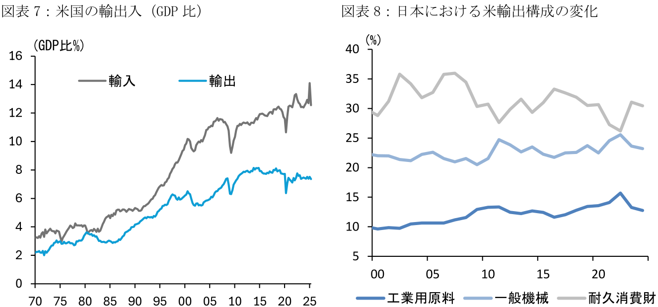 そもそも、足下における米国の貿易赤字は輸出よりも輸入によるところが大きい(図表7)。輸入を減少させるためには、米国の国内消費を抑制する、或いは米国内生産を増やす必要がある。米国の実効関税率は8月7日時点で2024年と比べて+12.8%pt上昇しており、仮に輸入の価格弾力性を1と仮定すると、これは4.218億ドルの輸入削減効果を持つ。国内消費の落ち込みを回避しながらこうした輸入削減を実現するためには、米国内生産で代替できるよう巨額の設備投資が必要であり、トランプ政権は日本・EU・韓国による対米投資をこの実現の一助にしようと試みている。