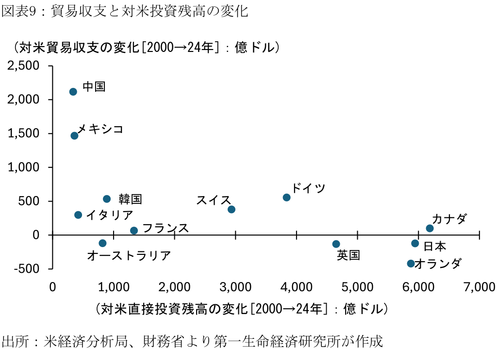 しかし、こうした海外からの投資で経常赤字の解消に取り組むのは2つの留意点がある。まず、仮に米国内に生産を移したとしても、完全な内製化が実現する可能性は低く、部品や生産設備などの従来と異なる品目の輸入が米国で増える可能性がある。実際、2020年から24年における対米直接投資と対米貿易収支の変化をみると、対米直接投資の多い国は対米貿易黒字を拡大こそしていないものの、大きく対米赤字(黒字の縮小)に向かっているわけではない(図表9)。