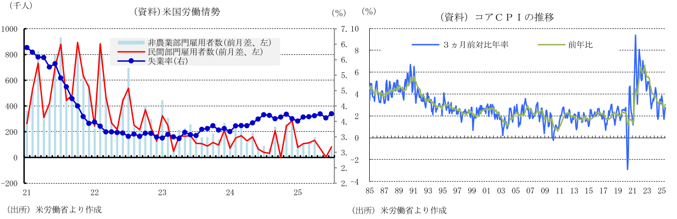 年後半は、通商合意による不確実性の和らぎを背景とした設備投資の拡大や、農作物やエネルギーの輸出拡大が期待できよう。一方、これまでの実質金利の上昇や、価格上昇が経済活動の抑制要因になると考えられる。個人消費は、株や不動産などの資産残高の増加が押上げ要因になるものの、雇用・所得の伸び鈍化、価格上昇等を背景に緩やかな伸びとなり、米経済は潜在成長率を下回る成長に減速する公算が大きい。インフレは、関税賦課の影響が徐々に顕在化するなかで、緩やかに上昇する可能性が高い。このような環境のもと、FRBは、更なる景気減速や労働市場の軟化を回避するために、9、12月のFOMCでそれぞれ25bpの利下げを実施すると予想される。ただし、失業率の大幅な上昇など労働市場が悪化すれば、利下げ幅は拡大されよう。