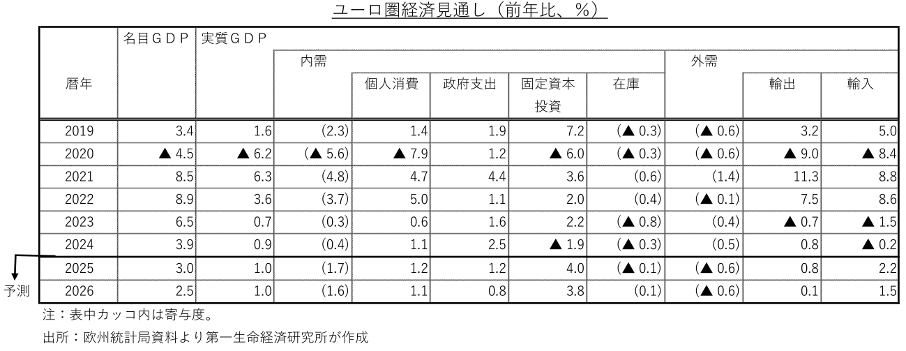 過去数年のユーロ圏経済は、スペインやイタリアなど南欧諸国が堅調な景気拡大を続けるなか、ドイツやフランスなど中核国の景気低迷が足を引っ張り、緩慢な成長にとどまってきた。スペインは、移民流入による人口増加や外国人旅行客の増加を背景に、高成長を続けている。イタリアは欧州復興基金からの資金拠出が景気回復を支えている。ドイツの景気停滞は、ロシア産エネルギー資源の輸入を打ち切った結果、エネルギー価格が高止まりし、輸出競争力を失ったことや、長年の緊縮的な財政運営が足枷となっている。フランスでは、財政不安や政治リスクが経済活動の重石となっている。