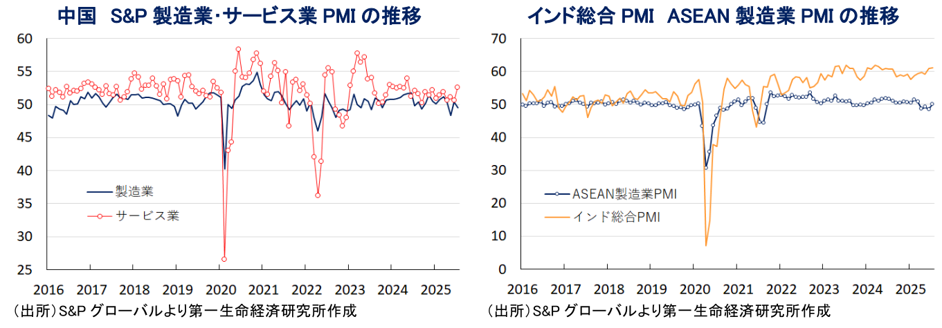 米国は、アジア新興国に対する相互関税の税率を概ね20%前後とすることで合意しており、当初懸念された悪影響は一定程度減じられると期待される。しかし、米国は一部のアジア新興国との間で、中国による迂回輸出を念頭に、第三国から当該国を経由して米国に輸出した財に上乗せ関税を課すことで合意した模様であり、米中摩擦が激化する背後で対米輸出を大幅に拡大させてきた国にとっては、そうした流れに変化が生じる可能性がある。また、米国はインドに対して、ロシア産原油の輸入を理由に関税を上乗せする方針を示しており、同国経済は輸出依存度が相対的に低いものの、仮に上乗せ関税が課されれば一定程度景気に下押し圧力が掛かることは避けられない。その一方、アジア新興国のインフレは落ち着いた動きをみせており、各国中銀はトランプ関税による外需下押しが懸念されるなか、景気下支えを目的に金融緩和の動きを強めており、個人消費をはじめとする内需を下支えすることが期待される。さらに、インドは10月からGST(財・サービス税)の引き下げなど、財政政策により景気下支えを図る方針を示している。よって、トランプ関税をきっかけにした世界貿易の萎縮が新興国経済の足かせとなる懸念はくすぶるものの、内需が景気を下支えする展開が期待される。