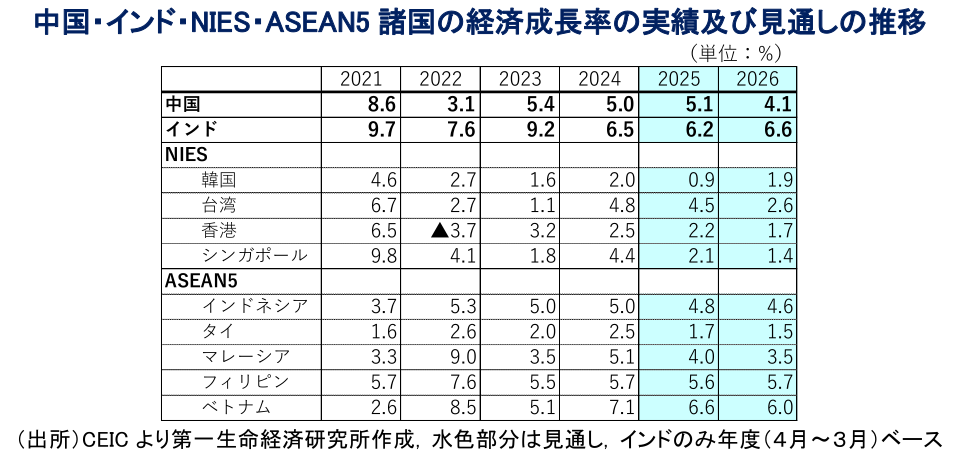 また、米国はここ数年の米中摩擦の背後で米国向け輸出を拡大させるなど、その『漁夫の利』を得たアジア新興国に対して軒並み高水準の相互関税を課す方針を示した。しかし、米国は相互関税を一旦発動させるも、直後に一律分(10%)を維持する一方、上乗せ分の発動を延期して個別に協議を行うことを決定した。よって、今年前半については、トランプ関税の本格発動を前にした駆け込みの動きが輸出を押し上げる展開となっている。さらに、ここ数年のアジア新興国は商品高や異常気象による食料インフレに直面してきたが、年明け以降の物価は落ち着いた動きをみせている。また、ここ数年の金融市場においては、米ドル高を受けた各国の通貨安が金融緩和を阻む一因となってきたものの、トランプ政権の政策運営を巡る不透明感などが米ドル安を促すなか、各国中銀にとっては金融緩和のハードルが低下している。このように個人消費を取り巻く環境は改善しているものの、トランプ関税を巡る不透明感が設備投資の足かせとなるとともに、雇用環境の重石となっており、多くの国において個人消費をはじめとする内需は力強さを欠いている。こうしたことから、今年前半のアジア新興国の景気については、経済構造面で外需依存度の高い国々を中心にトランプ関税の本格発動を前にした駆け込みの動きによって押し上げられていると捉えることができる。