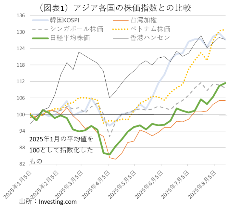 日経平均株価が、8月半ばに4万3千円台になり、史上最高値を更新する営業日が出てきている。日本株だけをみていると、「バブルの再来か?」という思いが浮かんでくるが、どうやらこの株高は世界の株価上昇と同調して起きているようだ。例えば、アジア株の中では、韓国(KOSPI)、香港ハンセン、台湾(加権)、シンガポール(FTSE)、ベトナム(VN)などの株価は軒並み上がっている(図表1)。香港ハンセンを除き、いずれも6月から最近(8月中旬)にかけて凄い勢いで上がってきた。その勢いは、ダウ、S&P500などいくつかの米国株価指数を上回っている。株式投資のアジア・シフトが起こっている可能性があるかもしれないと感じさせる。