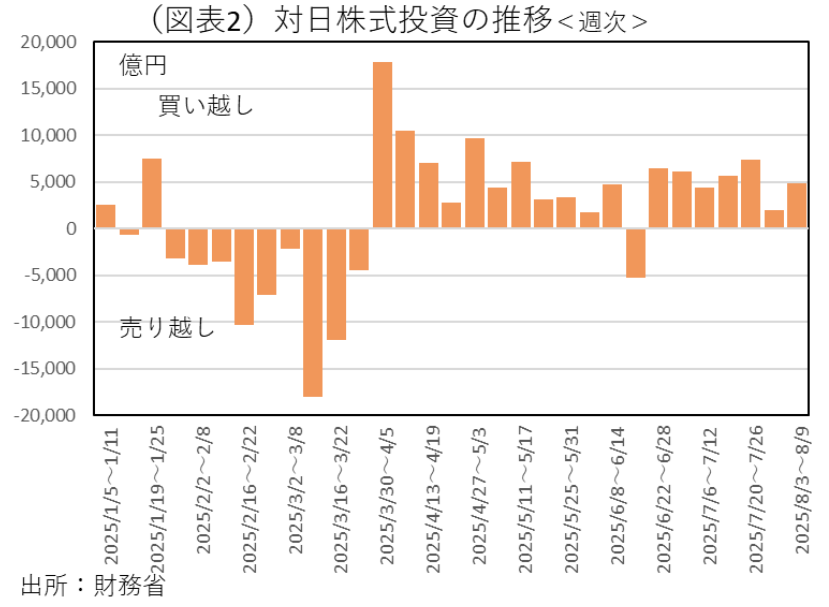 そのことは、先の財務省「対外及び対内証券売買契約等の状況」をみるとよくわかる。対日株式投資は、3月30日~4月5日の週からスタートし、8月9日までの19週間のうち、18週間で買い越し=流入超過である(6月15日の週だけが売り越しで、それ以外はすべて買い越し、図表2)。年間のように、アップダウンのある買い越しとは違って、2025年4月以降は連続的な資金移動が進んでいることが週次データの連続からわかる。