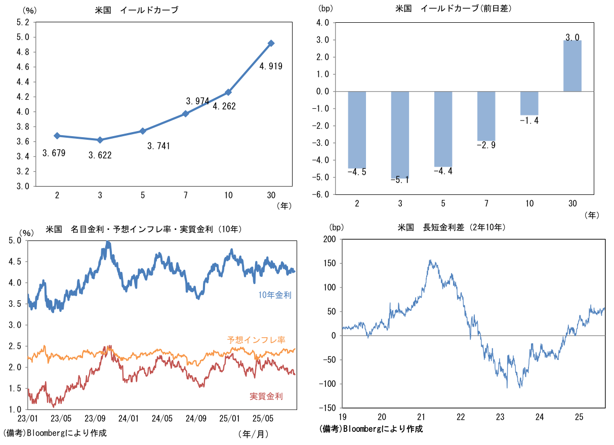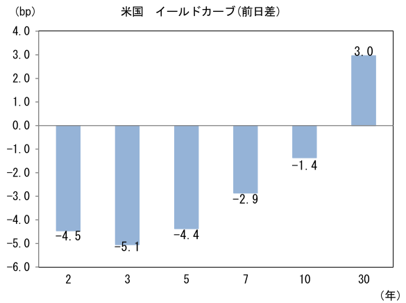 米金利はツイスト・スティープ化。予想インフレ率(10年BEI)は2.435%(+1.5bp)へと上昇。実質金利は1.825%(▲2.9bp)へと低下。長短金利差(2年10年)は+58.0bpへとプラス幅拡大。