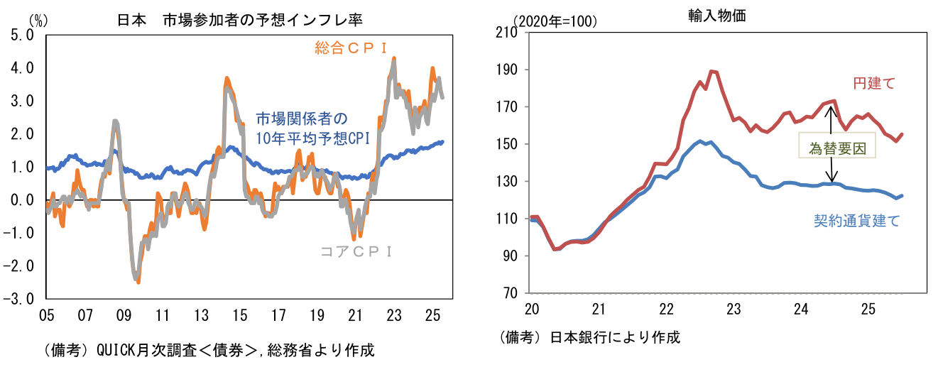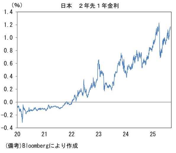 また米価格の高止まりが予想されていることも重要だろう。供給側の問題に対して金融政策(利上げ)が効果的であるかという疑問は残るが、食料品価格が高止まりする中、人々の予想インフレ率が高まっていることもあり、日銀は静観しにくくなっているのではないか。消費者のみならず、市場関係者の予想インフレ率も水準を切り上げている。その他では、引き続き円安にも警戒が必要だろう。円建ての輸入物価は前年比でみれば▲10.4%と上昇が一服しているものの、水準は2020年を100とすると155近傍にあり、家計を圧迫している。そうした下で、予想ターミナルレート(今次局面における政策金利の最終到達点)の代理指標である2年先1年金利は1.16%まで高まっており、3月の水準(1.2%程度)を視界に捉えている。