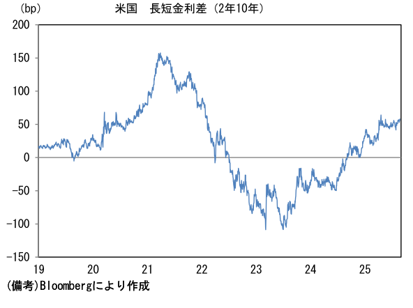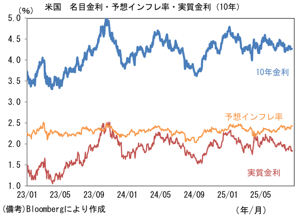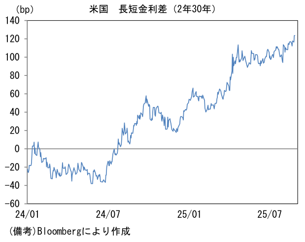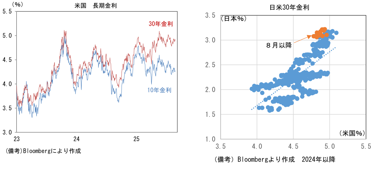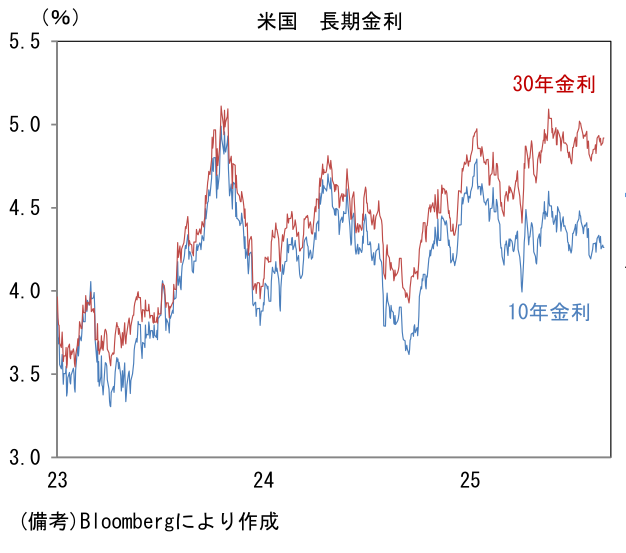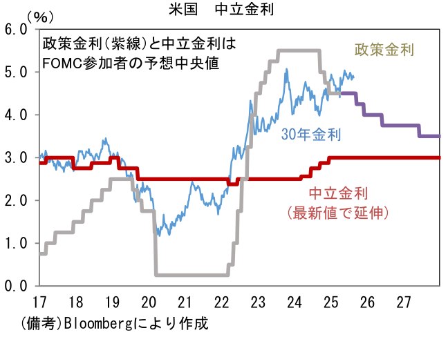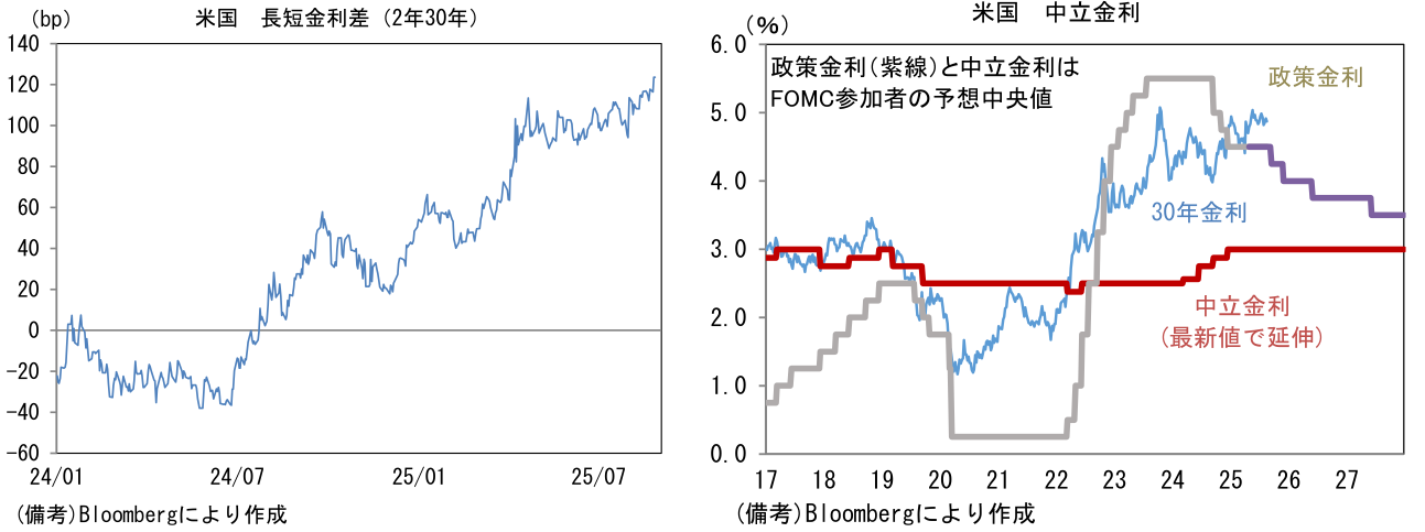 - 次に米長期金利に目を向けると、10年や30年金利の水準は落ち着いているが、足もとではイールドカーブの形状に変化が認められている。9月の利下げ再開が強く意識される中、FRBのクック理事の解任騒動を受け、中央銀行の独立性・信頼性に疑問を投げかける動きもあり、スティープ化が進行している。現時点で長短金利差が非連続的な拡大をするには至っていないが、クック理事が解任(退任)され、新たにトランプ色の強い理事が送り込まれれば、FRBが政権の支配下に置かれるとの警戒が強まり、場合によっては(超)長期金利の上昇(≒長短金利差拡大)に拍車がかかる可能性がある。また別の視点でみても超長期金利が上昇ないしは高止まりする可能性がある。きっかけになり得るのは、FOMC参加者が推計する中立金利の上方修正であろう。ドットチャートの中央値に基づけば推計値は現在3%とされているが、平均値では3.17%まで高まっている。中長期的な政策金利見通しが高まれば、30年金利に影響を与えるだろう。もちろん、米長期金利の上昇は日本の(超)長期金利に上昇圧力をかける。