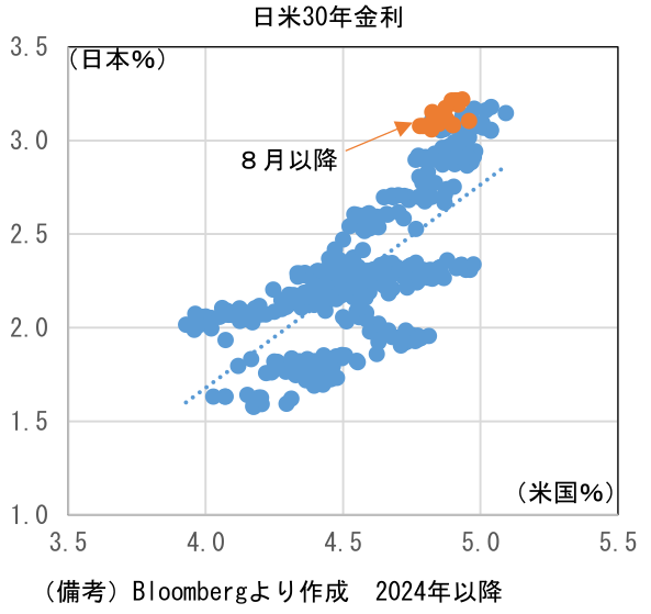 最後の日本の財政要因については、石破政権の存続可能性がやや高まったことで、それが長期金利の上昇を抑制するとみている。共同通信が23、24両日実施した世論調査では、内閣支持率が35.4%で、前月から12.5ポイント上昇。依然として不支持が49.8%と差はあるものの、ひとまず支持率低下に歯止めがかかった。石破茂首相が「辞任するべきだ」との回答は40.0%で、「辞任は必要ない」は57.5%であった。現在の日本のように財政支出拡大を求める野党が、税制規律の崩壊を防ぐ役割を担わざるを得ない与党に攻勢をかける構図が成立する下において、与党の支持率拡大は財政支出の拡大観測を減じる。