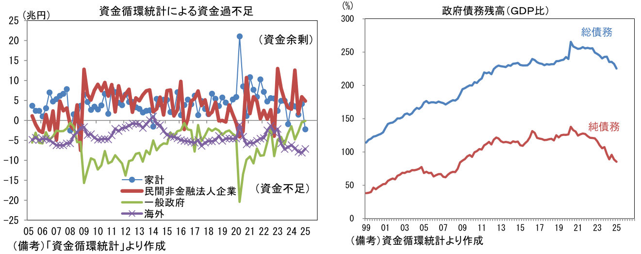 政権基盤が脆弱な中、シルバー民主主義やバラマキ体質などと揶揄されるように、政府が不人気政策を採用しにくくなっている面は否めないが、日本の財政事情は必ずしも悪化していない。資金循環統計に目を向けると、一般政府は貯蓄超(黒字化)が目前に迫り、政府債務残高のGDP比は低下基調にある。「財政不安→金利急上昇・円急落」という単純かつ悲観的な展開にはならないのではないか。