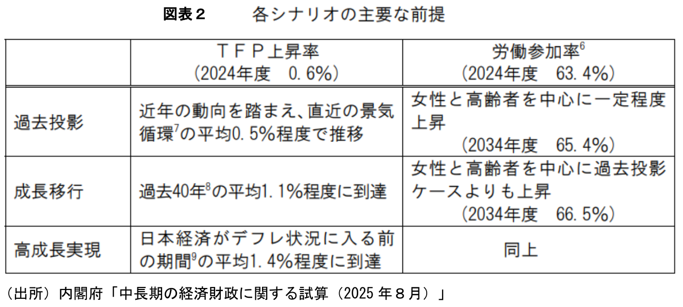 中長期試算では、人口動態が我が国の経済財政の行方にどう影響するかを考えるフレームワークとして、生産関数アプローチを導入している。生産関数アプローチとは、一国の潜在成長率が労働投入量、資本投入量、全要素生産性(TFP)によって決定されると仮定し、その変数の動態から中長期の潜在成長率を推定する手法である。したがって、人口動態を元に労働投入量や資本投入量、TFPをシナリオ分けすることにより、中長期の潜在成長率を推定することが可能になる。以下、今回の中長期試算におけるシナリオ分けの主要な前提は以下の通りとなる。