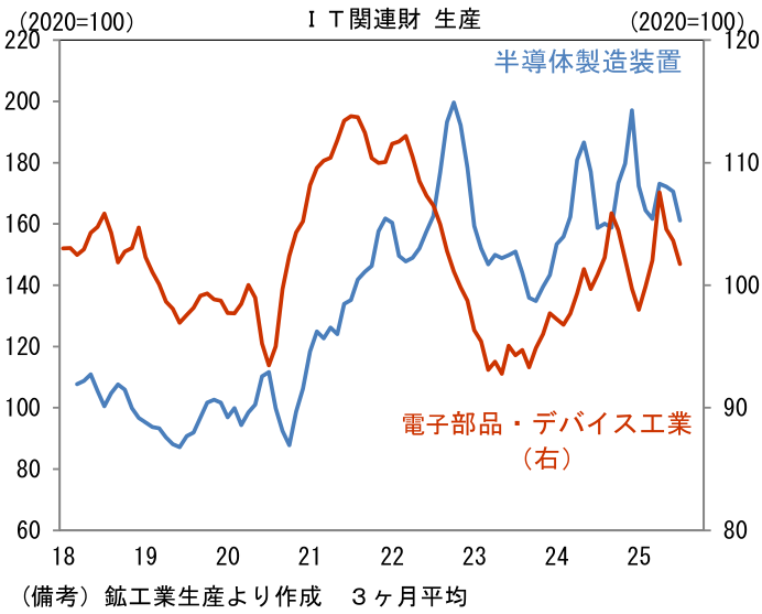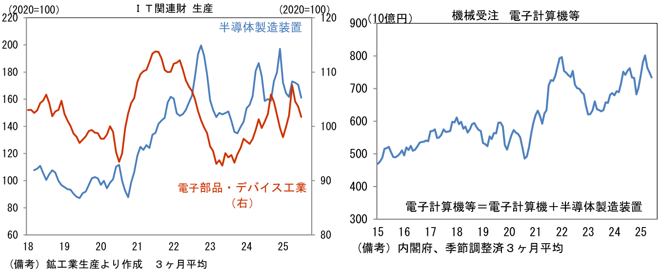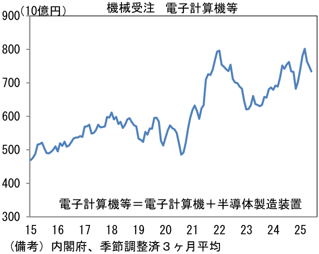 - 自動車と並ぶ重要産業である半導体関連については、電子部品・デバイス工業が前月比+2.4%と2ヶ月連続の増産となった。5月の大幅減産(▲14.8%)が響き、一時的に基調は下向きになっているが、2023年前半を大底とする回復局面は続いていると思われる。過去数ヶ月、大幅な変動を主導した集積回路(IC)は5月に同▲30.4%、6月に同+25.9%となった後、7月は同+3.8%と回復傾向にある。なお、2024年12月に稼働したと伝わっているTSMC熊本工場の生産分が、鉱工業生産統計に反映されているのか否かを含め経済産業省からの情報発信はない。他方、生産用機械に分類される半導体製造装置は同▲17.6%と大幅減産であった。関連指標の機械受注統計(機種別集計)における電子計算機等の受注額もやや下向き基調になっており、引き合いが軟調になっている可能性が示唆される。