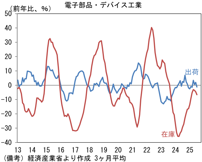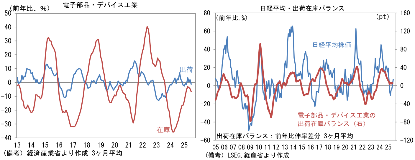 ここで長期的に電子部品・デバイス工業の出荷・在庫バランスと、日経平均株価が連動性を有してきたことを再確認したい。株価指数において半導体を直接手掛ける企業の存在感は必ずしも大きくはないが、半導体製造装置や化学品など「広義半導体」で見ればその存在感は大きく、結果的に日本株全体のうねりを作り出す構図があると筆者は理解している。足もとの出荷在庫バランスに底打ちの兆しが出てきたことは、7月下旬以降の日本株高を正当化しているようにみえる。