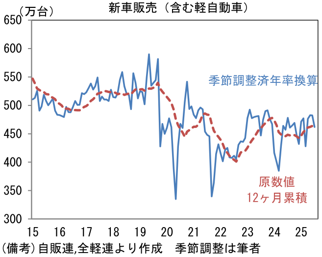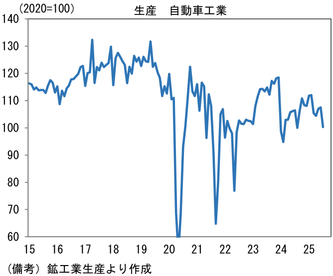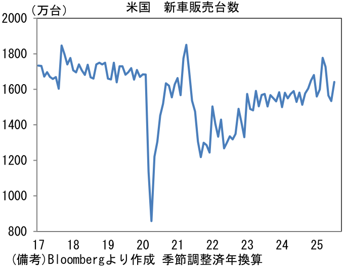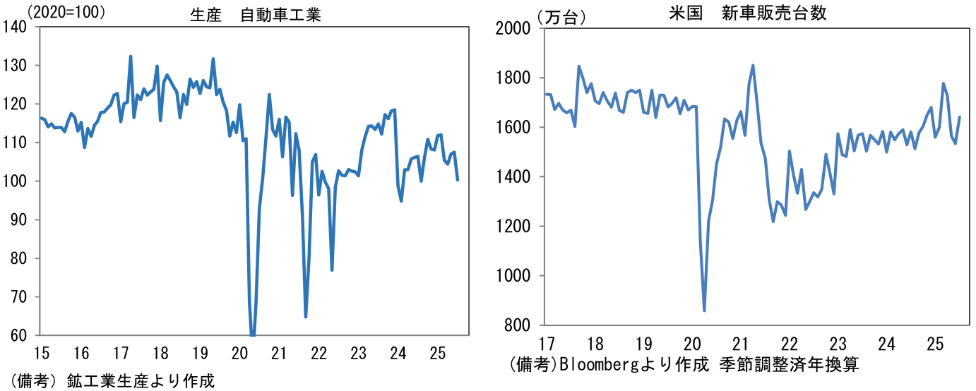 - 鉱工業生産全体の方向感を決める自動車工業の生産は前月比▲6.7%と大幅な減産となった。新車需要の弱さを疑いたくなるが、米国向けに関しては、トランプ関税(対自動車)が発動されて以降、日系メーカーは輸出価格の引き下げによって、現地の販売価格を据え置くことで販売数量の減少回避に努めており、米国向け需要に大きな変化はないと推察される。米国の新車販売台数に目を向けると、7月は年換算1641万台と持ち直し傾向にある。ローン金利の高止まり等を踏まえると、早期の回復には疑問符が付くが、それでも販売台数が趨勢的に落ち込む姿は想定しにくい。この間、国内では認証問題に起因する供給制約が緩和し、新車販売台数が持ち直し傾向にあり、筆者が試算した季節調整済み年換算値では460~480万台程度まで水準を切り上げている。そうした下で、輸送機械工業の生産計画は8月に同+5.2%の増産となった後、9月は同▲4.9%と減産が見込まれており、概ね横ばいの計画となっている。