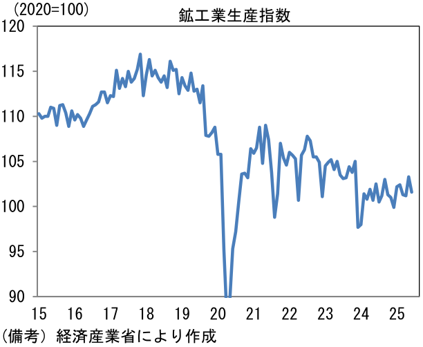 日本の2025年7月鉱工業生産は前月比▲1.6%と2ヶ月ぶりのマイナスとなり、市場予想(同▲1.1%)および経産省経済解析室の予測値(同▲1.0%)を下振れた。増産となったのは電気・情報通信機械工業、化学工業(除、無機・有機化学・医薬品)、電子部品・デバイス工業など6業種。品目別ではOSのサポート終了を控え、買い替え需要が発現したPCの増産が目立った。減産となったのは自動車工業、生産用機械、はん用・業務用機械など7業種であった。