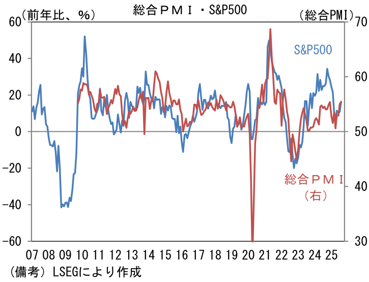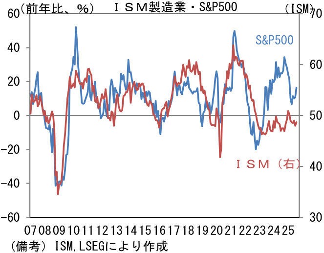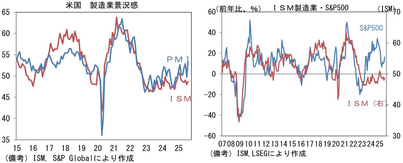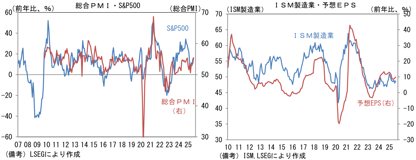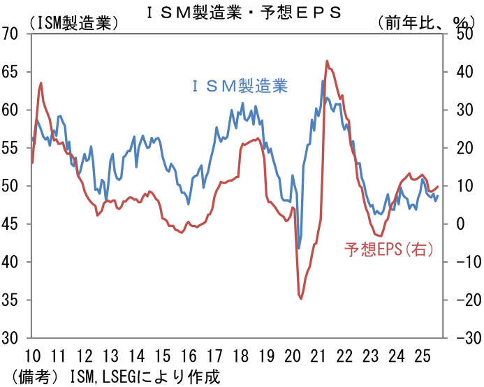 ここでISM製造業とS&P500の前年比を比較すると、米国株の過熱感が目立つ。サービス業を含んだ総合PMI(S&P Global社算出)でみれば、この違和感は和らぐことから、製造業の景況感が「使えない指標」に成り下がってしまったと考えたくなるが、ISM製造業とS&P500の予想一株当たり利益が概ね連動していることは改めて認識しておく必要があるだろう。類似指標の製造業PMIが53.0と堅調に推移していることに鑑みると、ISM製造業が弱さを誇張している可能性は否定できないが、業績拡大を伴った株価上昇を望むならば、ISM製造業が改善する経済環境が必要になってこよう。