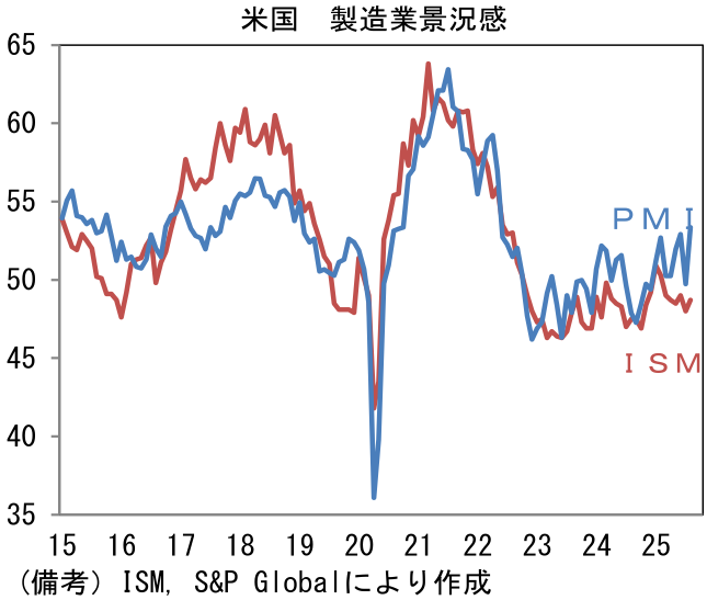 8月ISM米製造業景況指数は48.7へと0.7pt改善したものの、市場予想(49.0)を下回り、6ヶ月連続で50以下の水準で推移した。ヘッドラインを構成する5つの項目は、生産(51.4→47.8)が軟化した半面、新規受注(47.1→51.4)が50を回復、雇用(43.4→43.8)は低調な推移が続き、サプライヤー納期(49.3→51.3)はやや長期化、在庫(48.9→49.4)は増加方向に寄与した。その他ではトランプ関税の影響から支払価格(仕入価格)が63.7と高止まりした。