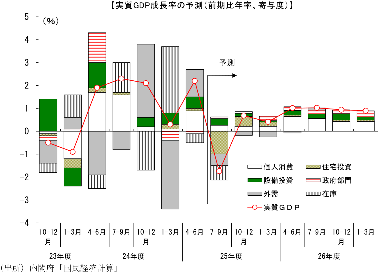 実質GDP成長率は25年度が+0.7%(25年8月時点予測:+0.6%)、26年度が+0.7%(同+0.7%)と予測する。4-6月期の成長率が2次速報で上方改定されたことを主因に、25年度の成長率見通しを小幅上方修正している。